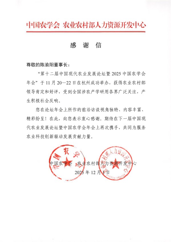 在第十二屆中國現代農業發展論壇暨2025中國農學會年會(杭州)中,陳渝陽董事長的前沿訪談獲高度評價,為農業科技創新凝聚了智慧;