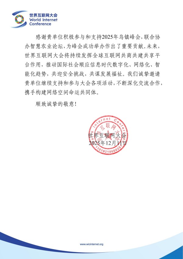 近日,浙江成人看片网站科技股份有限公司接連收到中國農學會 農業農村部人力資源開發中心,世界互聯網大會的感謝信,這是行業對成人看片网站在農業科技領域深度參與、創新貢獻的雙重肯定!